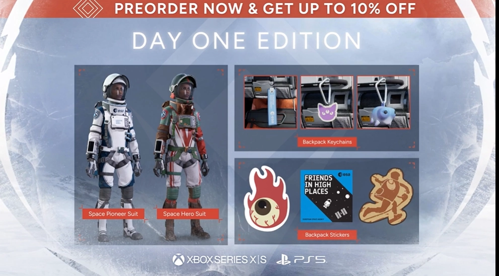 Jogadores de Xbox e PlayStation já podem reservar a Edição de Lançamento e garantir 10% de desconto em ambas as plataformas (exclusivamente para assinantes da PS+ no PlayStation). A Edição de Lançamento inclui o jogo e um pacote de itens cosméticos com 2 variantes de traje espacial e 6 acessórios para a mochila: 3 adesivos e 3 chaveiros.