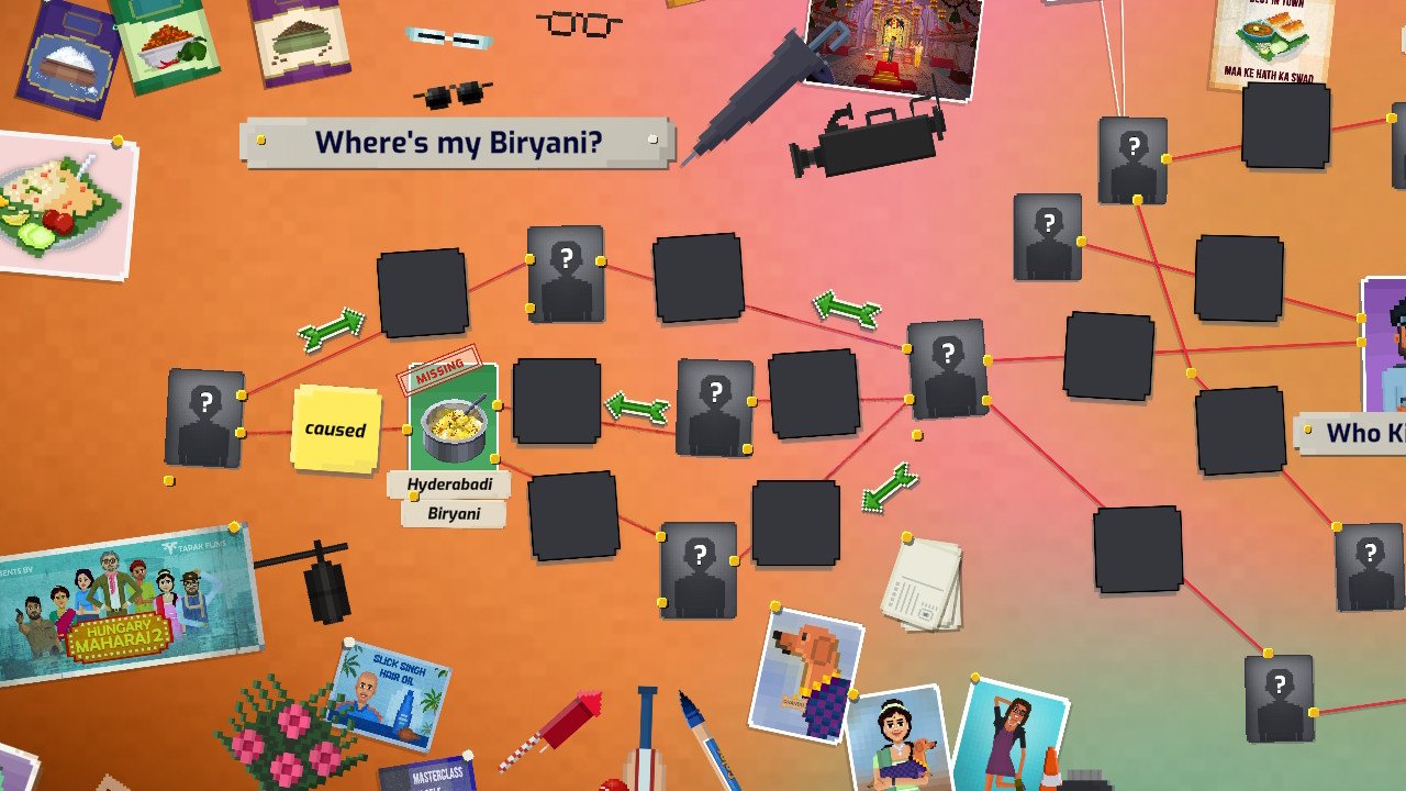 Desvende o caso juntando pistas no seu quadro de evidências. Converse com moradores locais peculiares neste bairro tipicamente indiano: alguns ficarão felizes em fofocar, outros insistirão em um favor ou troca antes de revelar tudo. De missões atrevidas a reviravoltas surpreendentes, cada conversa o aproxima da solução do mistério e da descoberta do culpado.