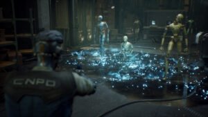 “No nosso mundo, Bishop é uma entidade robótica poderosa e imparável composta por múltiplas células mutáveis chamadas de Monks, e essas formas modulares, semelhantes a cubos, fazem parte desse conceito maior. Não são apenas efeitos visuais aleatórios – eles refletem o tipo de inteligência de máquina adaptativa e antinatural que tomou conta de partes da cidade. Sem dar muitos spoilers, eles mostram que o perigo em Artificial Detective vai muito além de robôs de serviço quebrados vagando pelas ruas. Há formas de máquinas mais avançadas, coordenadas e profundamente perturbadoras atuando nos bastidores.”