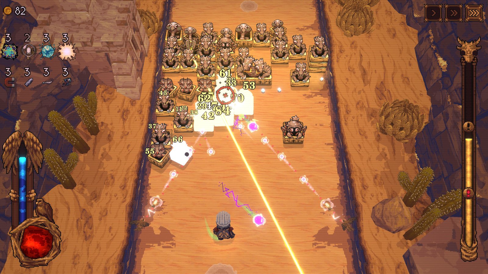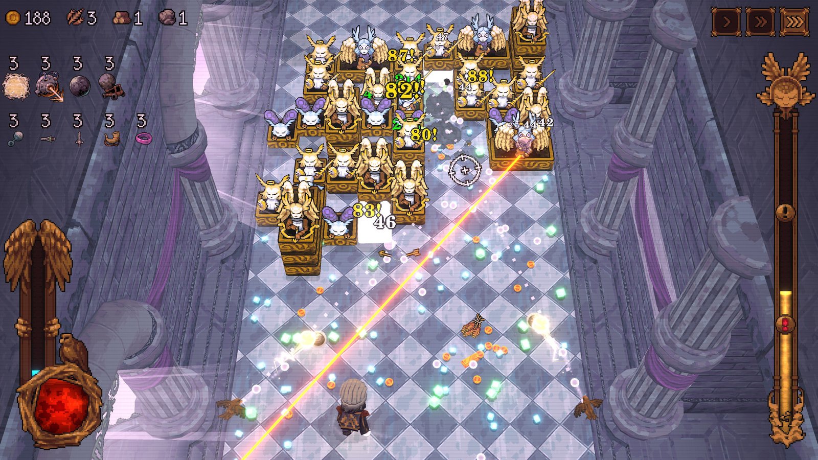 Agora você pode jogar como o Falcoeiro, um novo personagem que dispara duas bolas lançadas por um par de pássaros que flanqueiam a tela, dando aos seus ataques um amplo alcance. Ou assuma o papel do Festeiro, um membro da realeza medieval encrenqueiro que pode distorcer as trajetórias das bolas com um campo gravitacional pessoal, desviando os tiros de seus caminhos habituais.