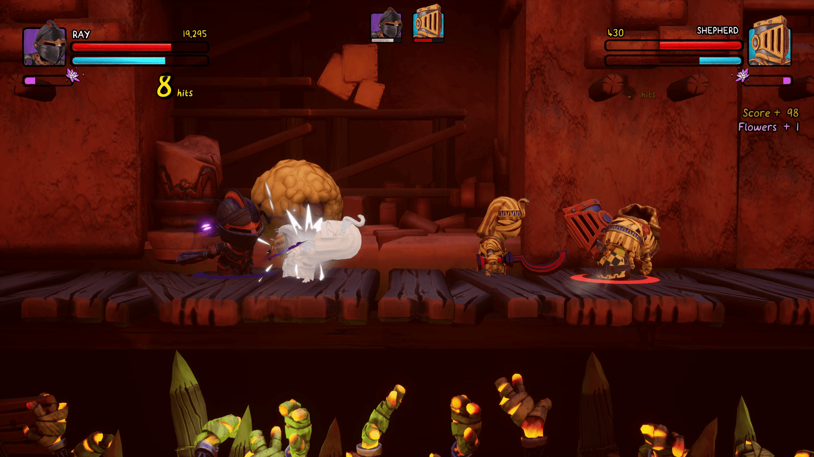 Big Helmet Heroes pode ser jogado tanto sozinho quanto em coop local para dois jogadores. A opção multiplayer adiciona um fator social divertido, permitindo que amigos enfrentem inimigos juntos e combinem ataques para derrotar hordas de goblins e outros adversários.
