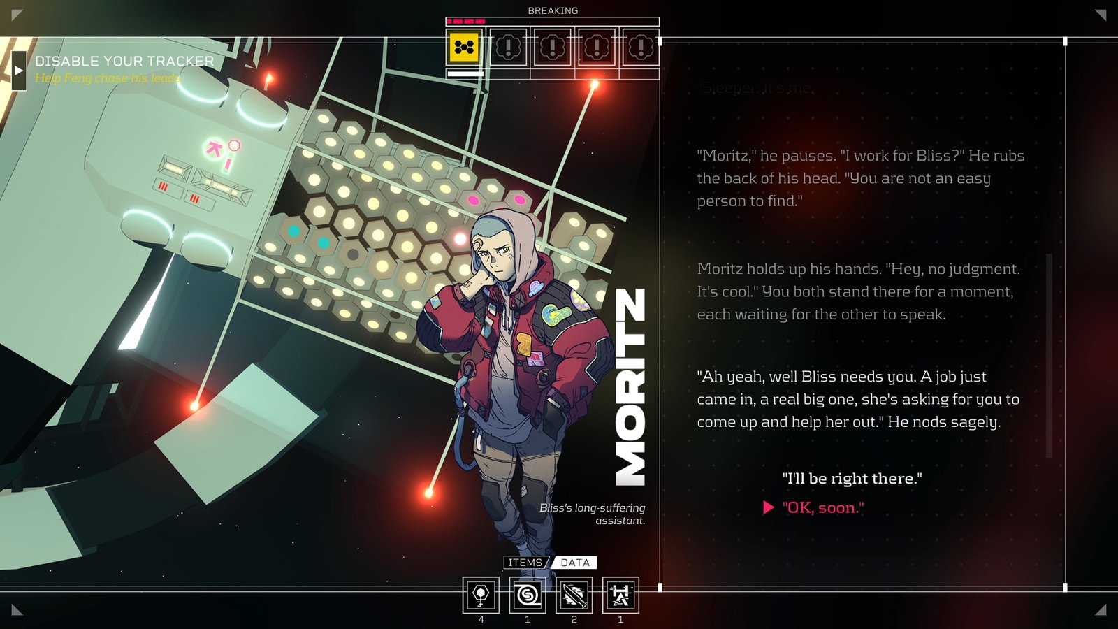 Um ponto extremamente negativo do jogo para nós brasileiros é que o Citizen Sleeper, não conta com suporte a legendas em PT-BR, e isso interfere muito para se ter uma experiência completa do jogo, já que o foco aqui é a narrativa e isso com certeza afasta vários gamers de curtirem 100% do jogo, pois nem todo mundo manja do inglês, eu mesmo domino bem a escrita e leitura em inglês e acredito que vários de vocês por aqui também, mas quando vem muitas palavras e frases que não são muito comuns no dia a dia, e com certeza temos dificuldades para compreender e que neste caso temos que recorrer ao dicionário ou algum tradutor online para entender tudo.