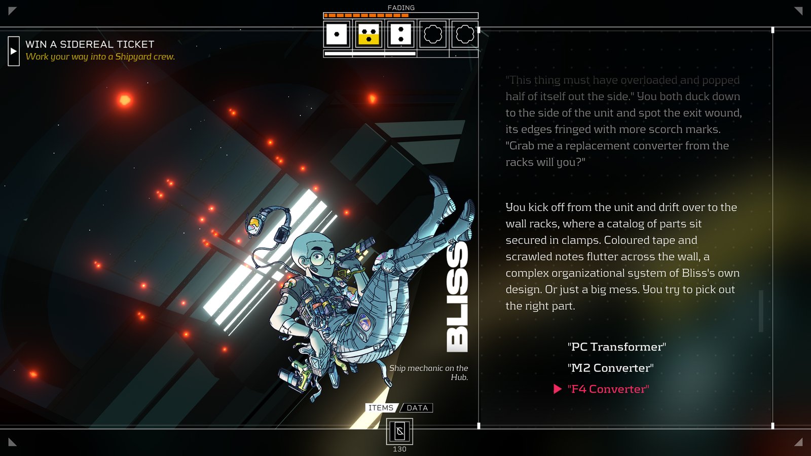 Em questão de jogabilidade, basicamente temos que administrar recursos da estação espacial que habitamos, como por exemplo temos cuidar da nossa condição ou seja ficar atento em não adoecer, temos que cuidar das nossas ações que meio que no jogo funciona como um sistema de turnos e por fim cuidarmos da nossa barra de energia que consiste em procurar comida pela estação, pelo que entendi podemos cultivar ou negociar/comprar de outros habitantes da estação.