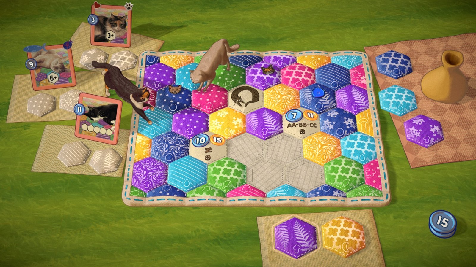 Quilts and Cats of Calico é um agradável jogo de tabuleiro, no qual sua tarefa principal é costurar uma colcha de retalhos. Ao combinar as cores e padrões desses retalhos, você pode não apenas ganhar pontos com seu design, mas também costurar botões e atrair gatos adoráveis, que têm preferências particulares quanto aos padrões de costura.