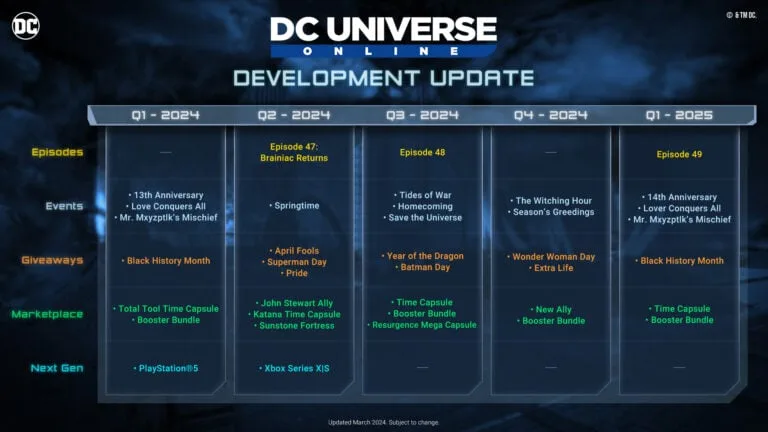 Continue lendo para ver algumas das grandes novidades que estamos trazendo para o DC Universe Online em 2024 e além. O que se segue são os nossos planos apresentados da forma mais transparente possível, com base no que sabemos ou esperamos que seja verdade – a partir de agora.” – Kendricke White