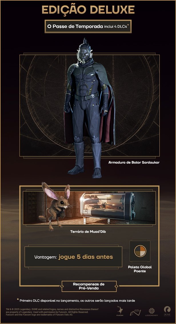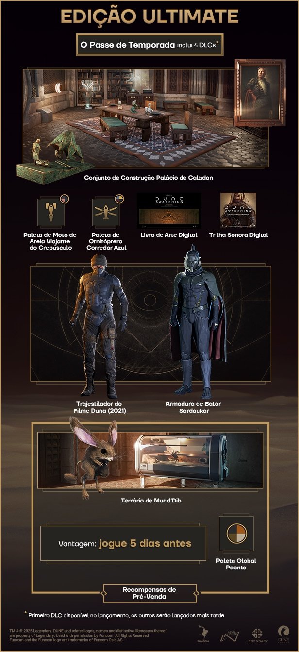 Com a Edição Deluxe você também receberá a ameaçadora armadura dos Sardaukar, a força militar de elite pela qual os jogadores são caçados no jogo. A Edição Ultimate adiciona tudo acima, além do icônico traje destilador de Paul Atreides do filme de 2021, um livro de arte digital, trilha sonora digital, padrões de cores exclusivos e o Conjunto do Palácio de Caladan com peças de construção, itens posicionáveis e decorações.