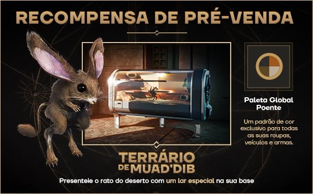 Adquirindo qualquer uma das edições – incluindo a padrão – na pré-venda, os jogadores receberão um padrão de cor universal que pode ser aplicado a veículos, armas e armaduras, bem como o Terrário de Muad’Dib, uma decoração na base que abriga o icônico rato do deserto.