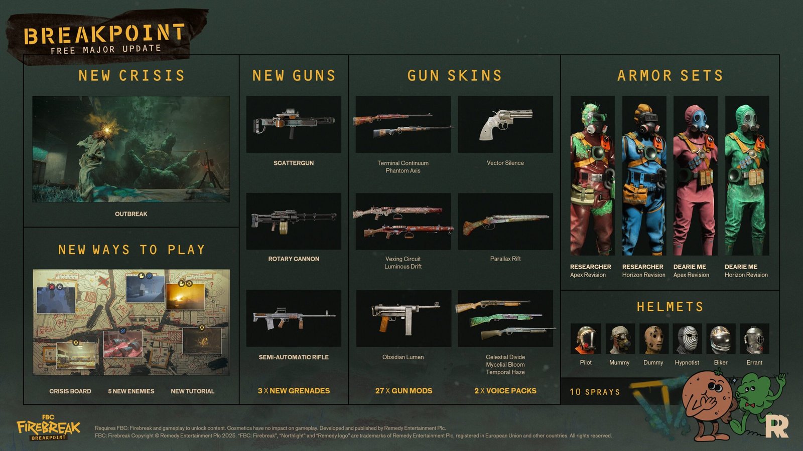 - Novo Conteúdo – Surto – Uma nova Crise (anteriormente Serviço), que se passa no setor de Pesquisa da Casa Mais Antiga. Os Firebreakers devem pesquisar e conter um perigoso aglomerado de mofo, enquanto lutam contra novos inimigos. A atualização também adiciona três novas armas, granadas, itens cosméticos e muito mais.
