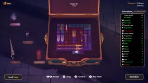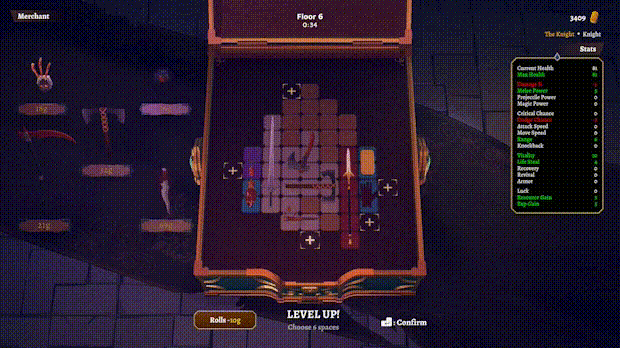 É um sistema que mistura o prazer de otimizar com o vício de experimentar. Em um dos meus melhores runs, por exemplo, uma simples rolagem mágica se tornou o centro da estratégia, cercada por adagas que ganhavam força apenas por estarem próximas dela.