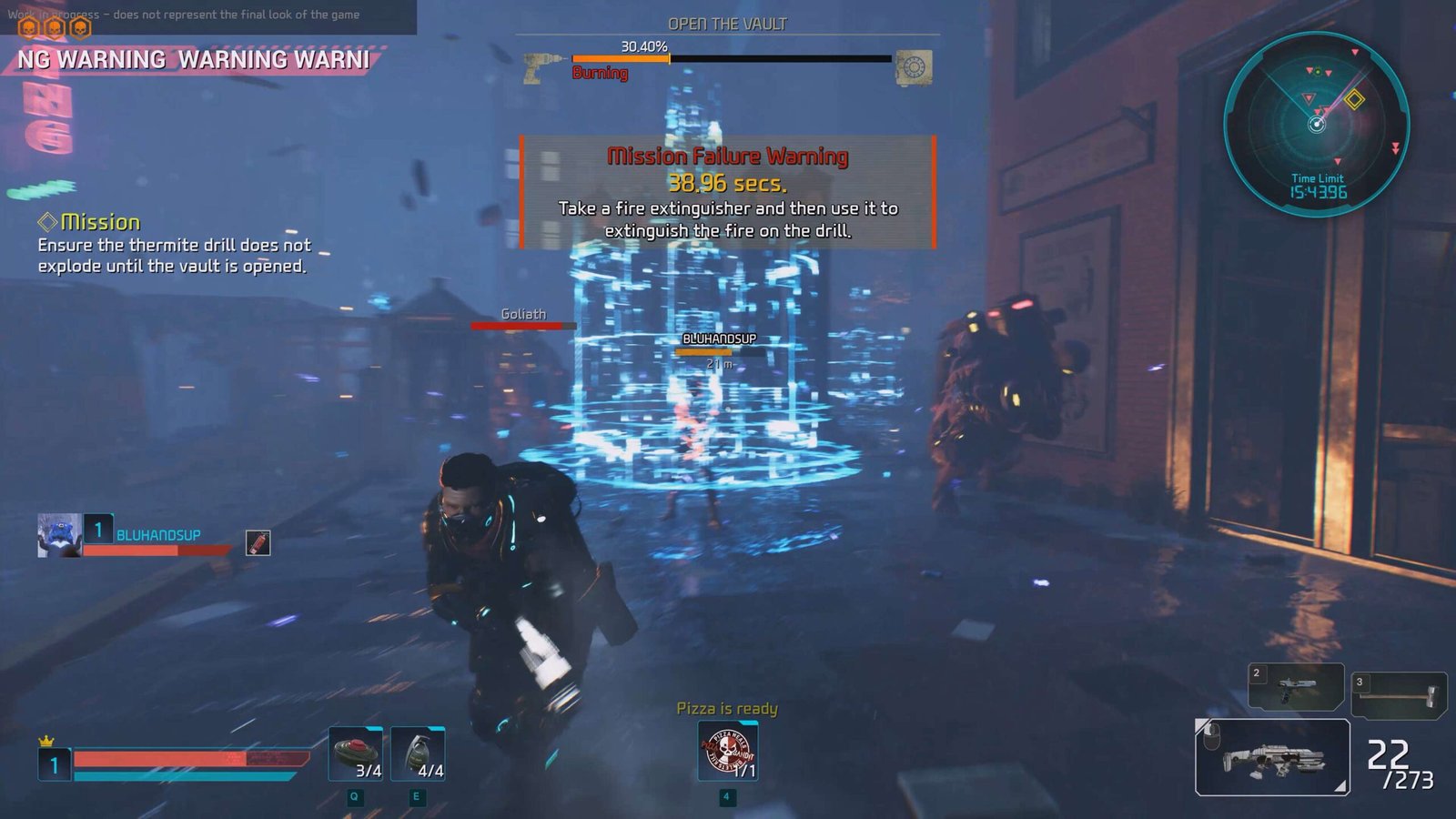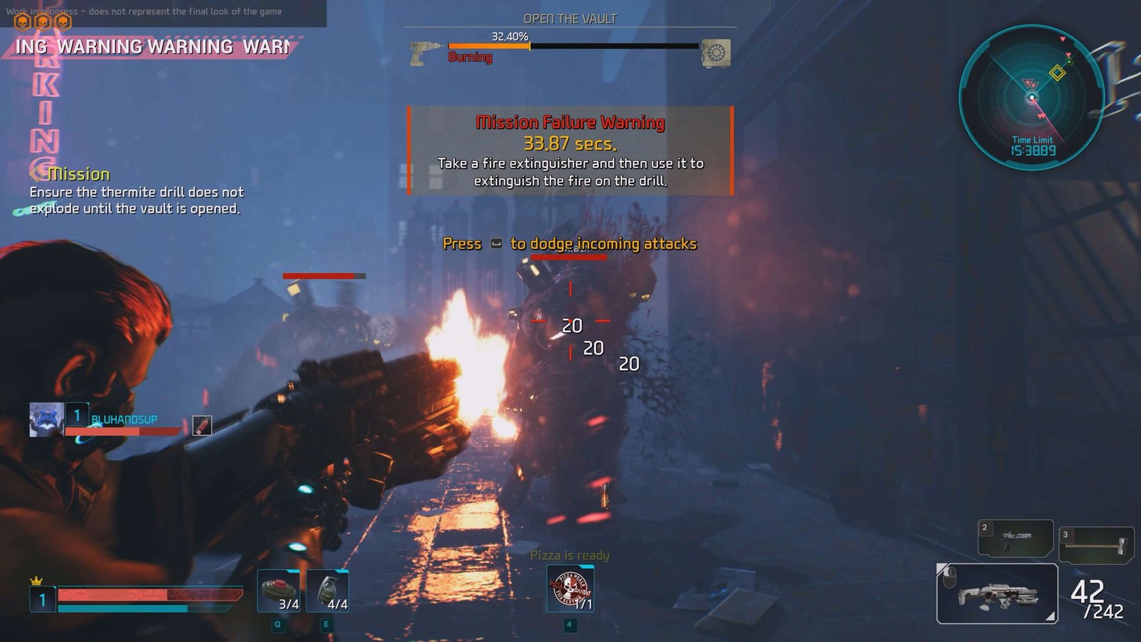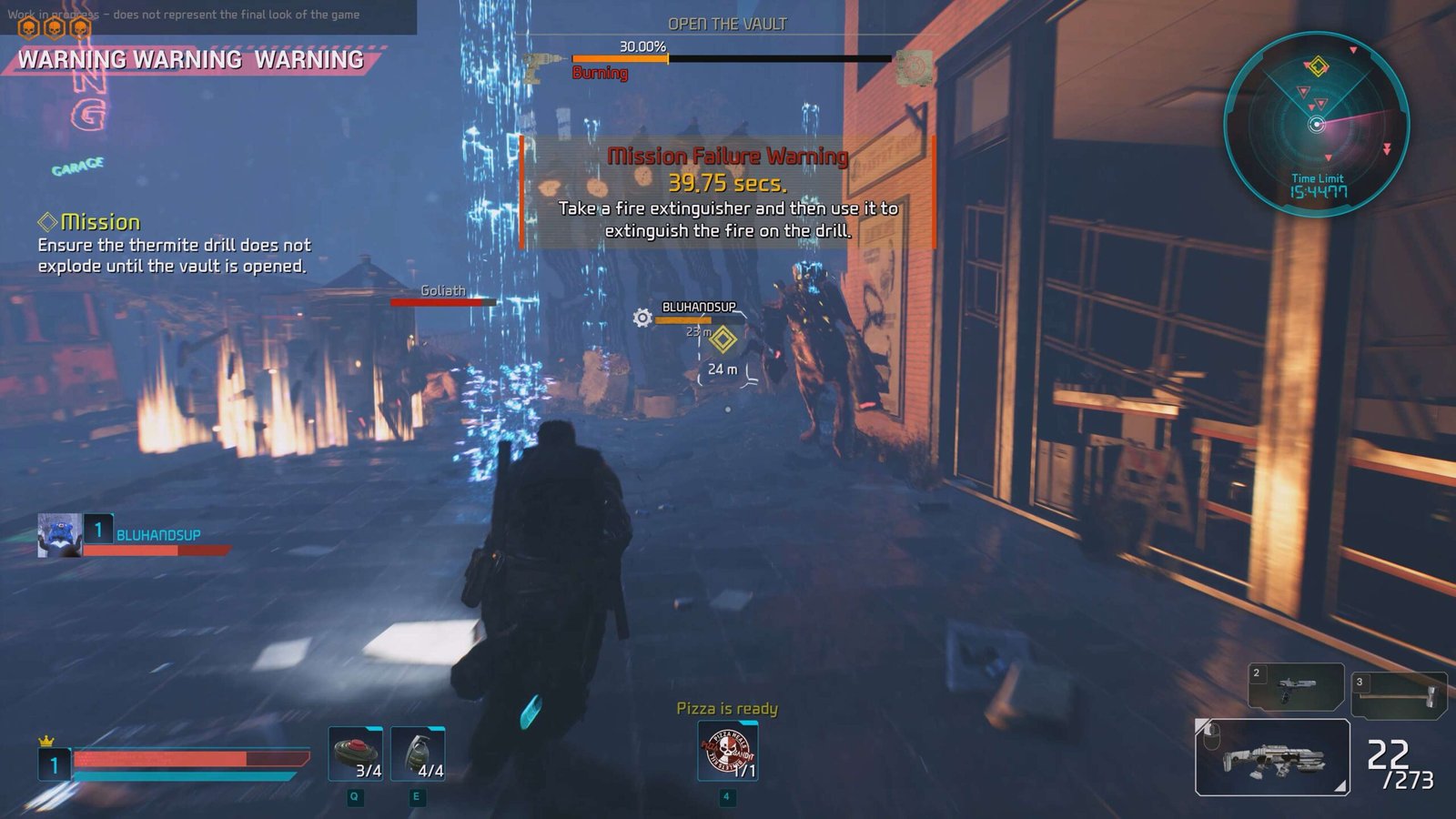 - Missões e Combate : A jogabilidade mescla missões icônicas e mecânicas de combate , como assar pizza em Overcooked e tiro em terceira pessoa por cima do ombro em Gears of War . Cada missão tem cinco níveis de dificuldade que rendem recompensas bônus quanto maior a dificuldade.