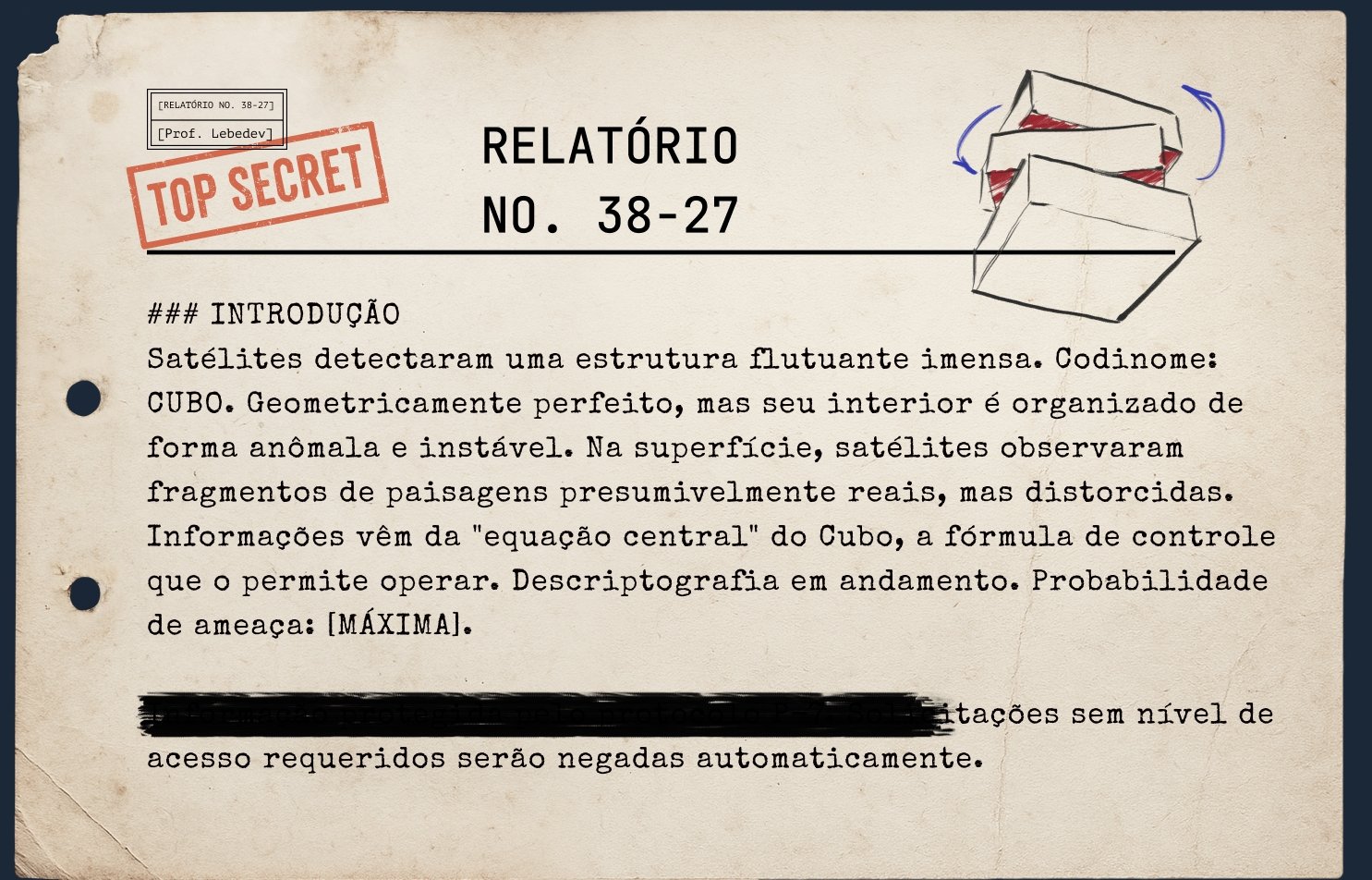À primeira vista, é um objeto geometricamente perfeito, mas, na verdade, é um lugar anômalo e mutável, repleto de inimigos cruéis. Mas o mais aterrorizante de tudo é a equação escondida no núcleo do Cubo. Decifrar a equação pode salvar a humanidade; não conseguir isso significa a extinção.