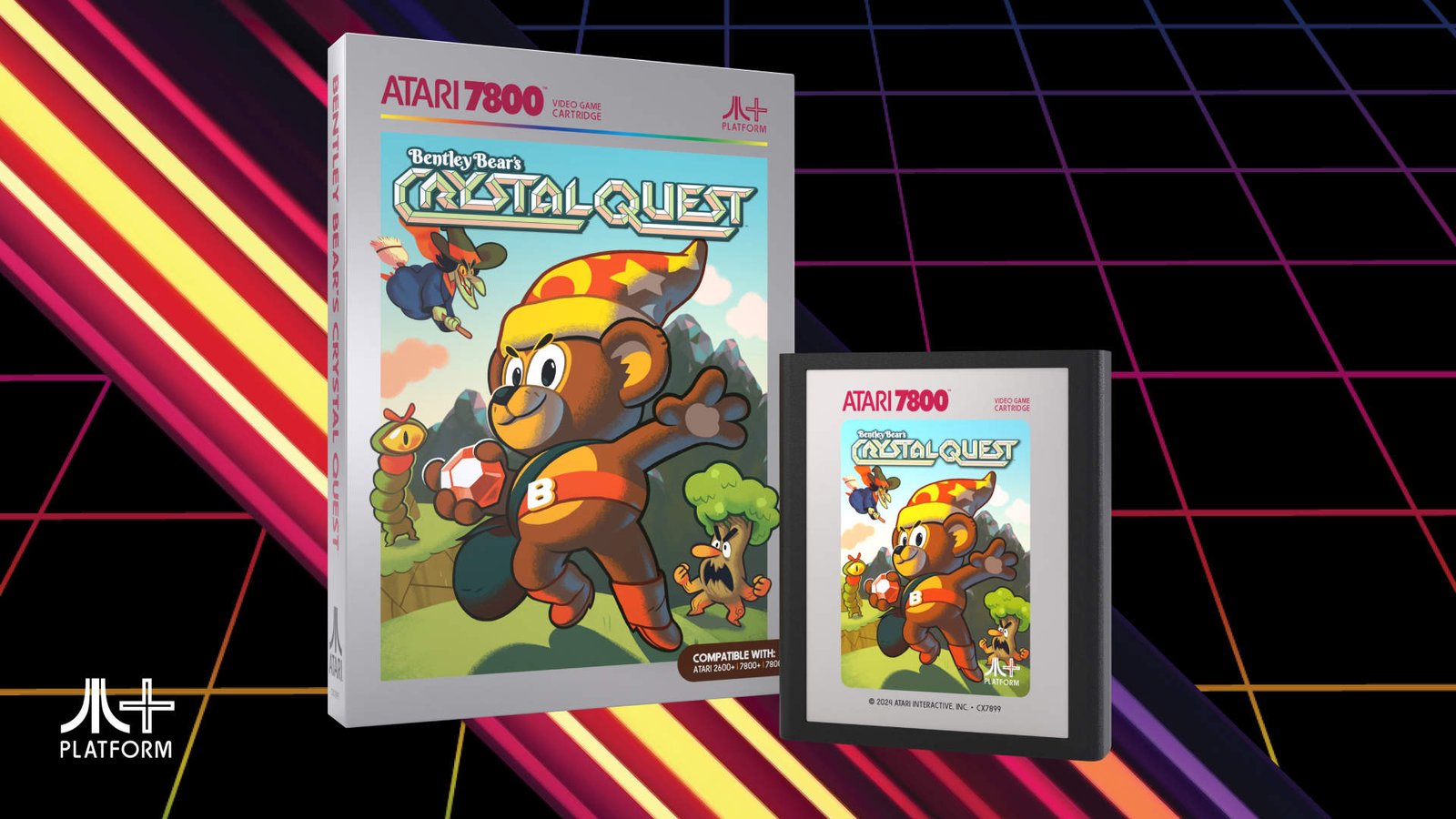 O 7800+ usa HDMI para se conectar a TVs e dispositivos modernos e reproduz jogos 2600 e 7800 novos e originais, com compatibilidade quase universal com cartuchos originais e de terceiros. Cada console é fornecido com o CX78+ Wireless Gamepad e um cartucho de jogo Crystal Quest 7800 da Bentley Bear.