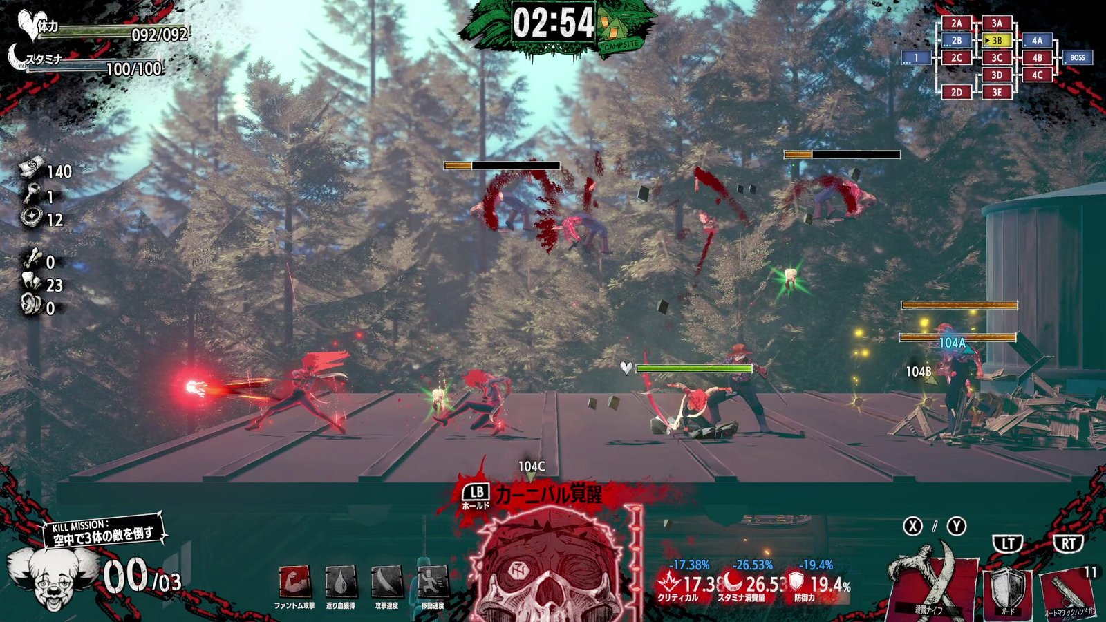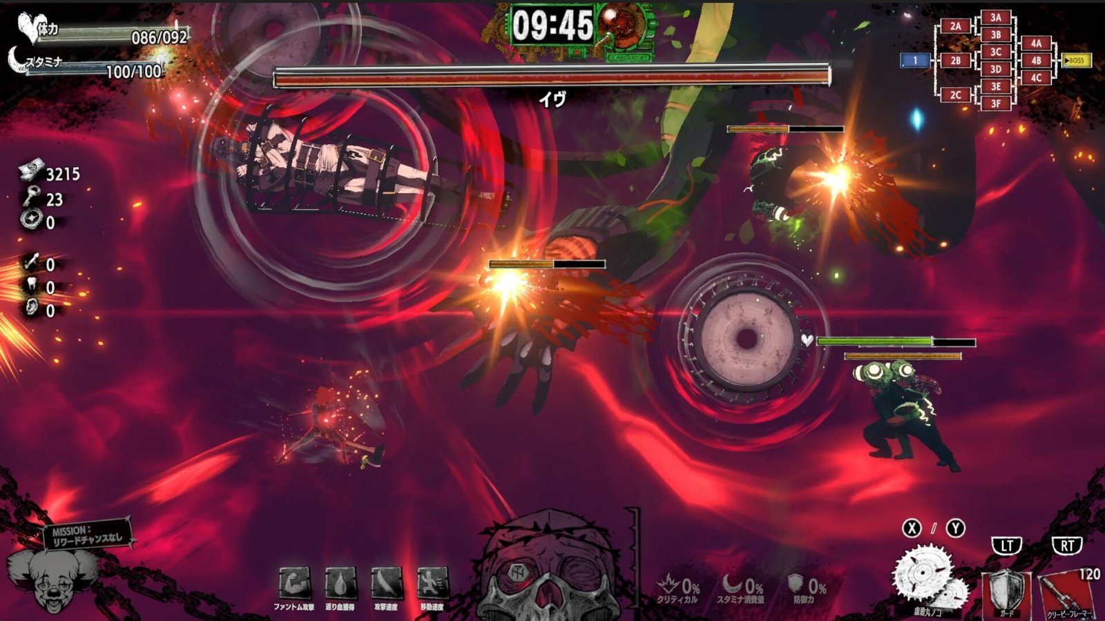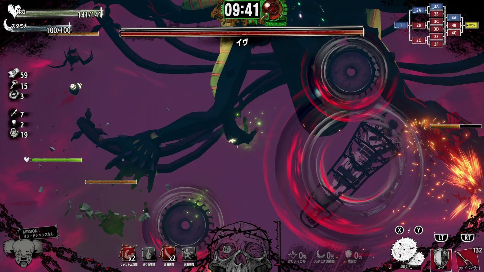À medida que você abre caminho através dos inimigos e se banha em seu sangue, suas habilidades ficarão mais fortes… mas o sangue secará com o tempo, então você precisa continuar atacando. Fique de olho no medidor do crânio na parte inferior da tela: quando seu banho de sangue atingir o auge, você poderá ativar um poderoso super ataque “Carnival Awakening”!