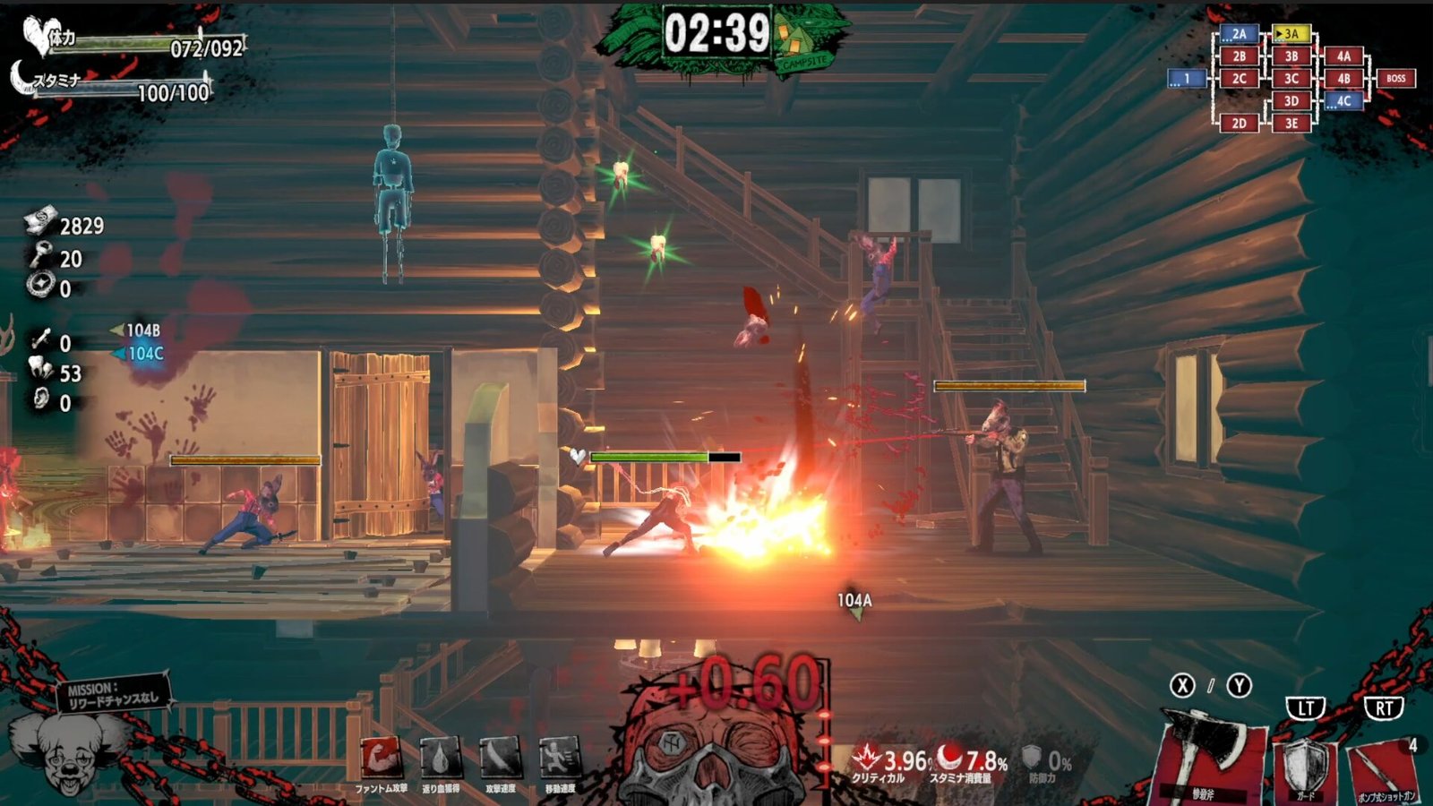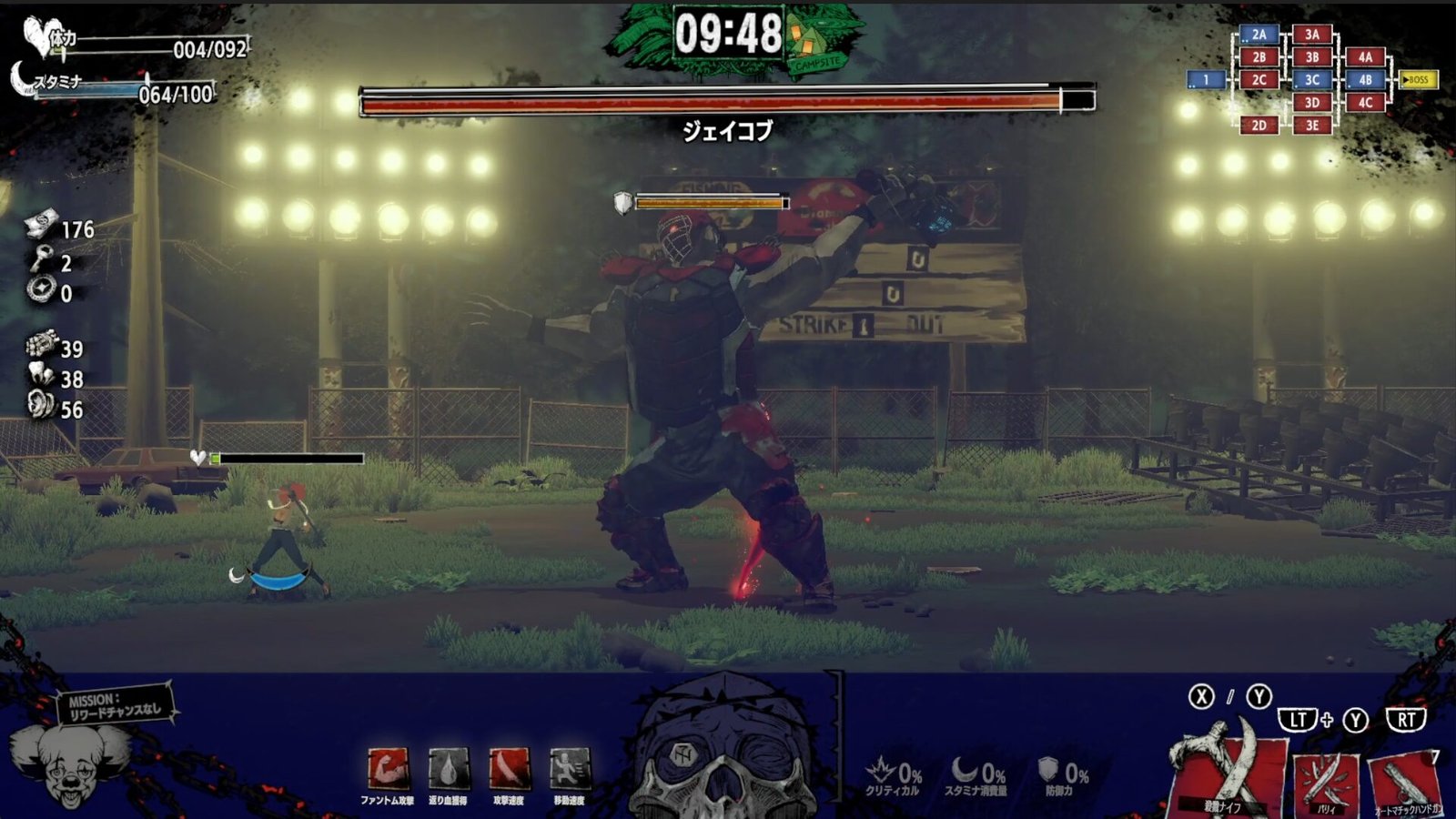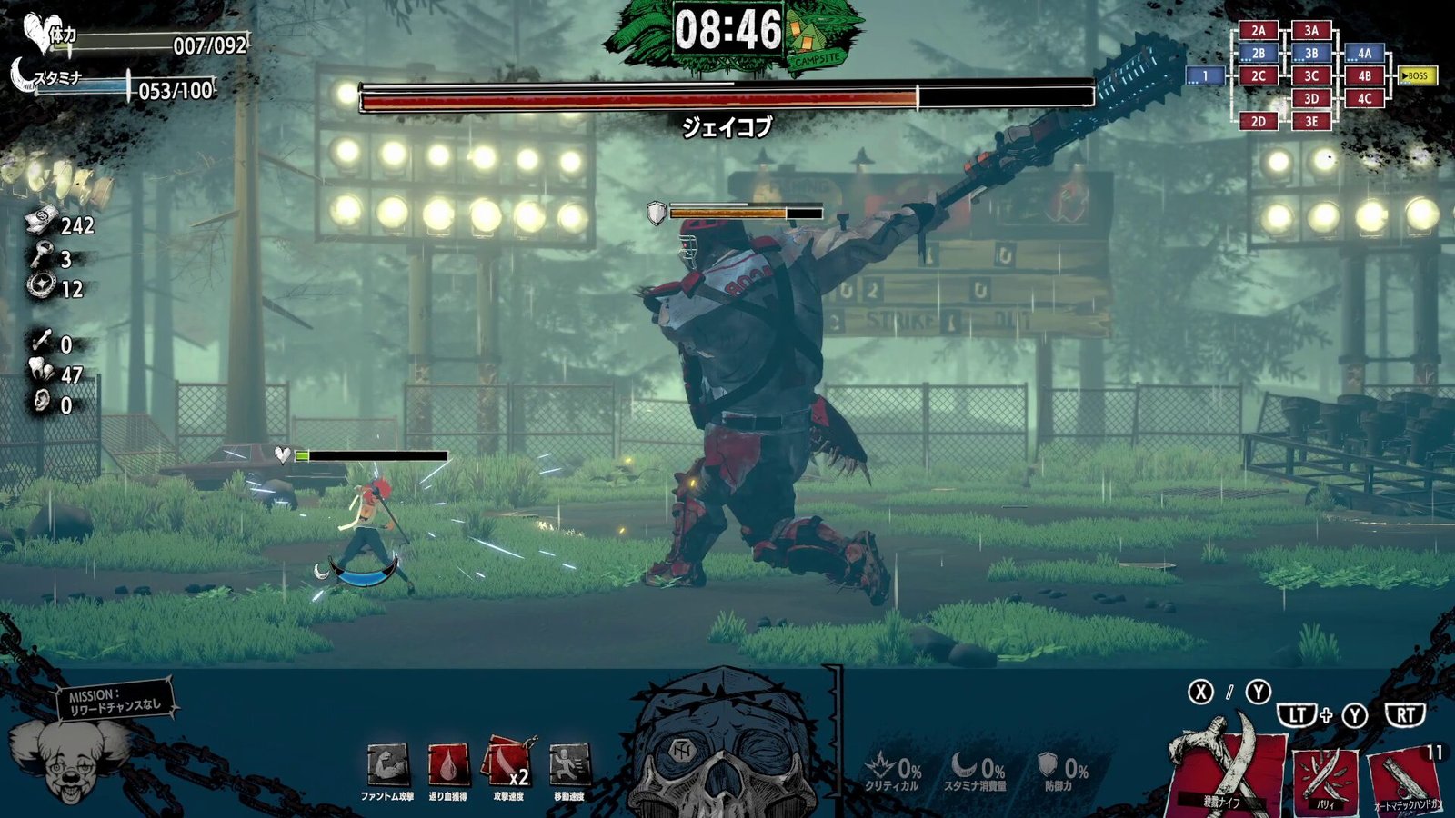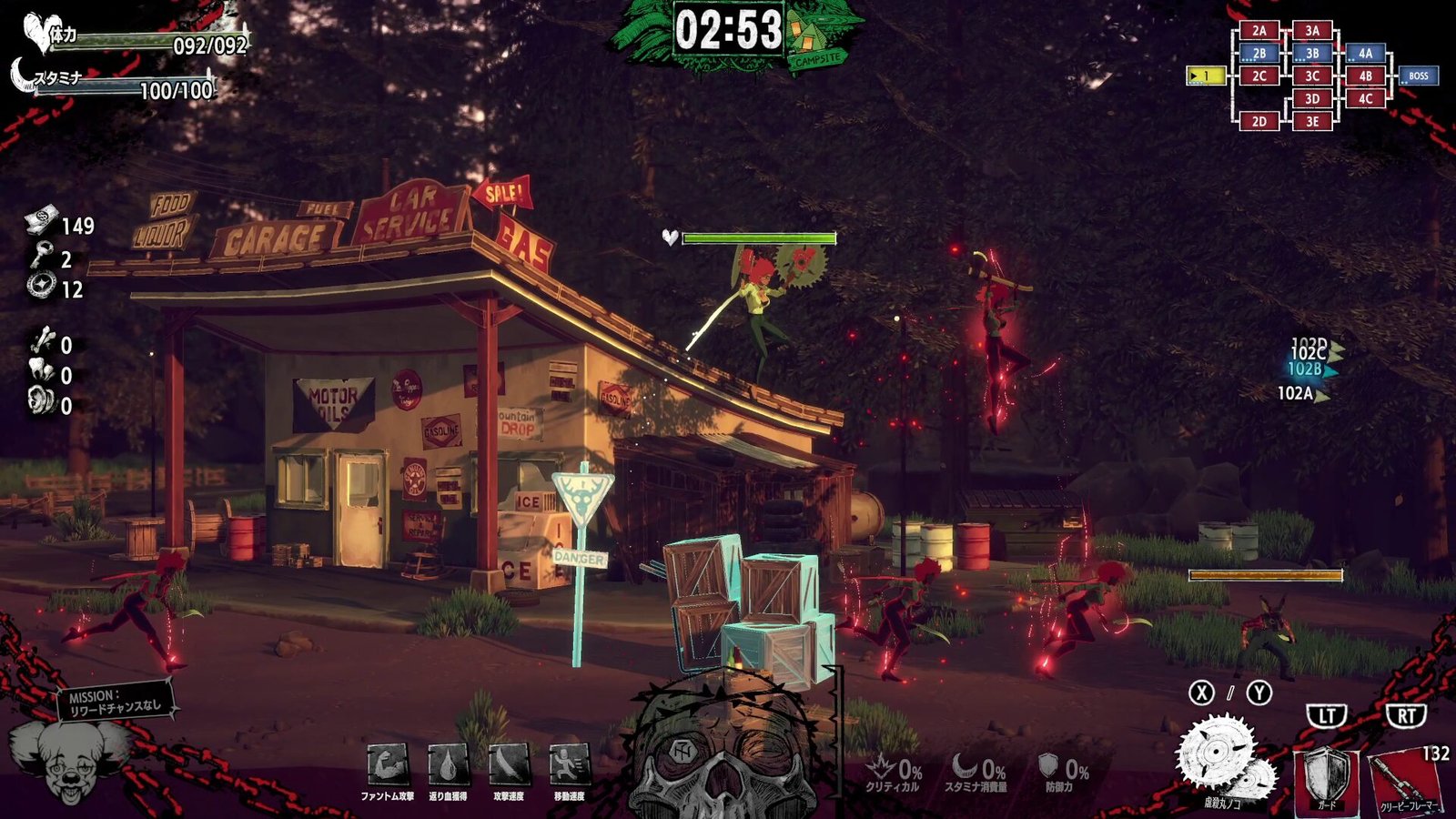 À medida que você abre caminho através dos inimigos e se banha em seu sangue, suas habilidades ficarão mais fortes… mas o sangue secará com o tempo, então você precisa continuar atacando. Fique de olho no medidor do crânio na parte inferior da tela: quando seu banho de sangue atingir o auge, você poderá ativar um poderoso super ataque “Carnival Awakening”!