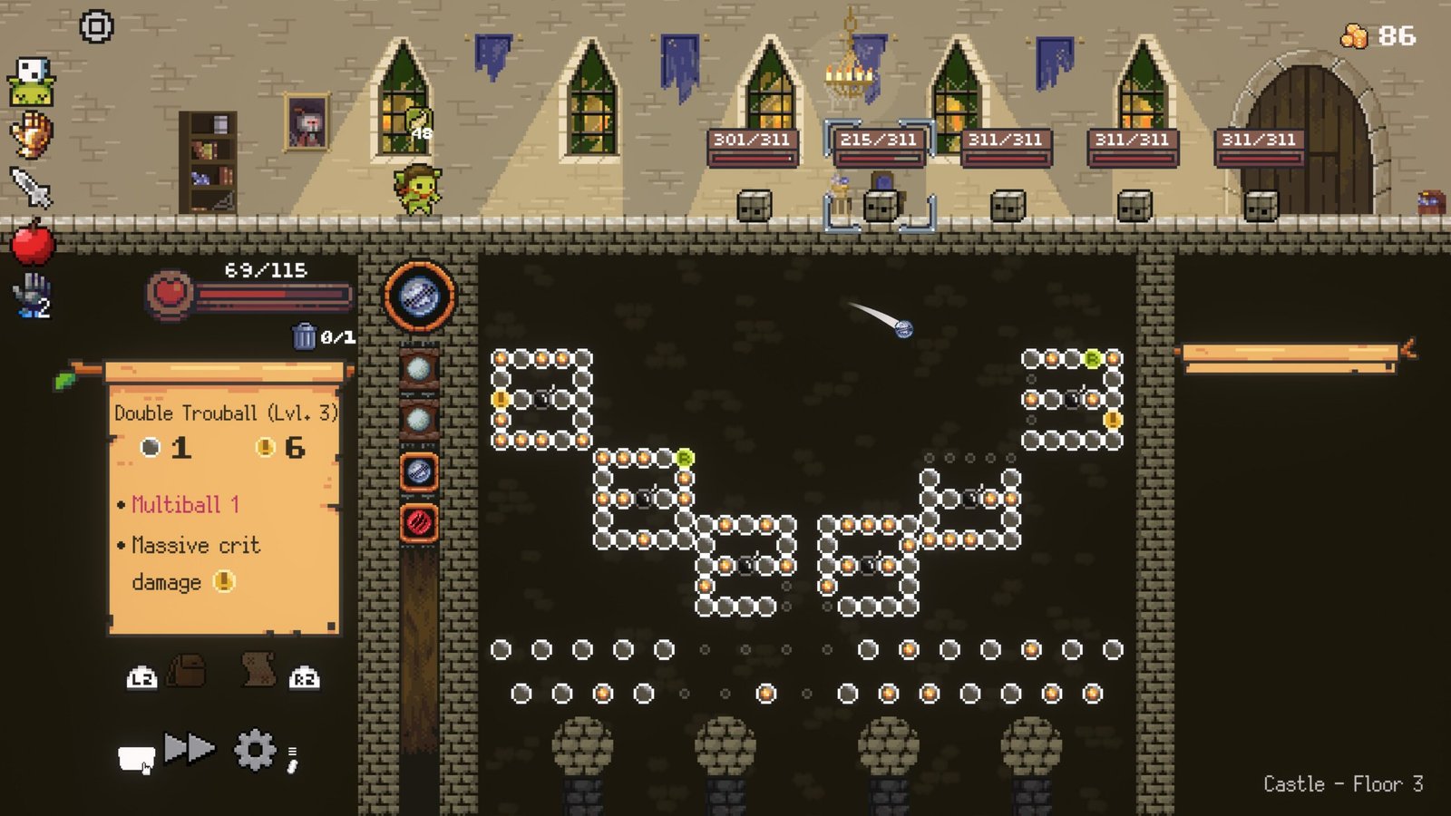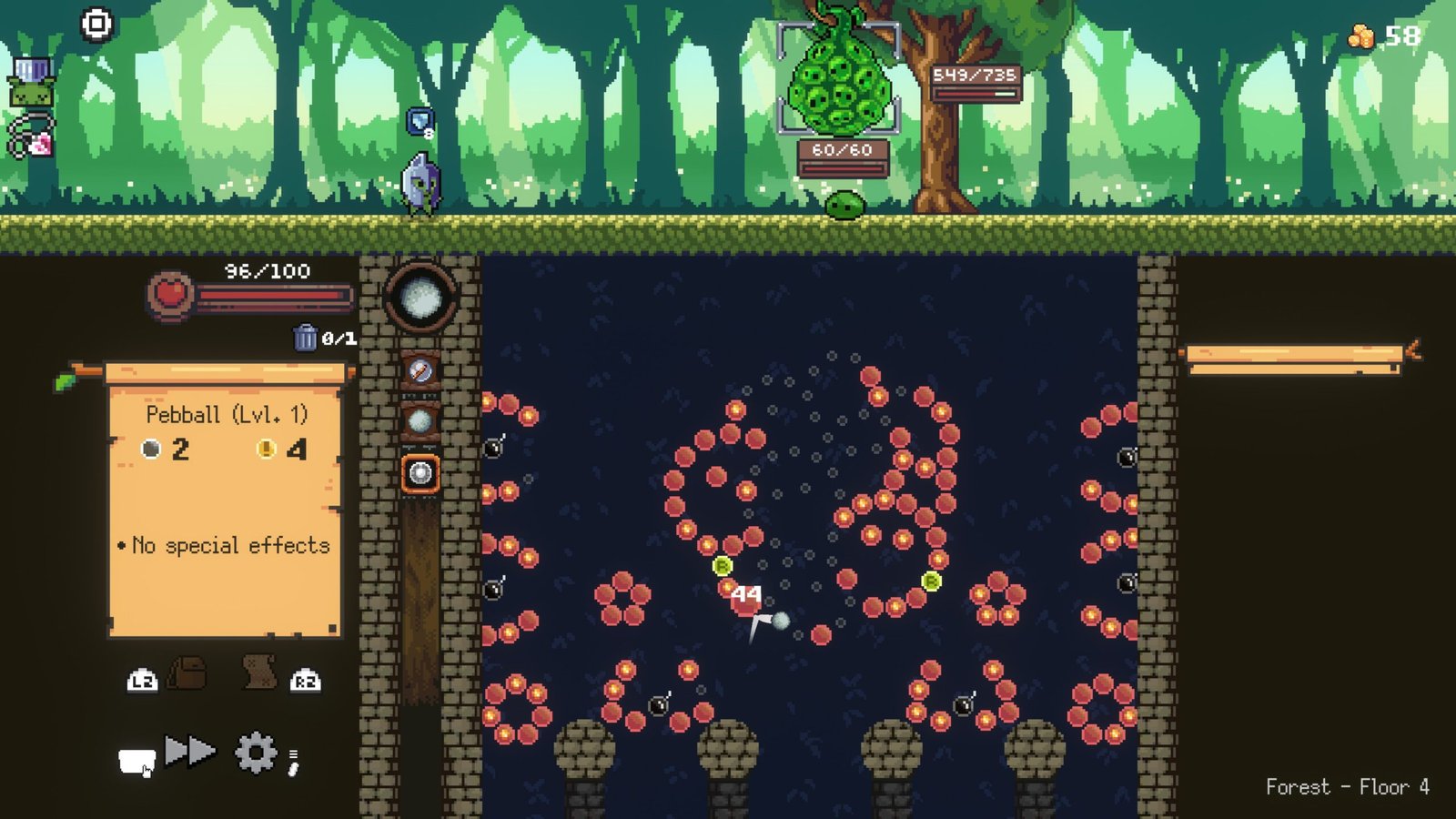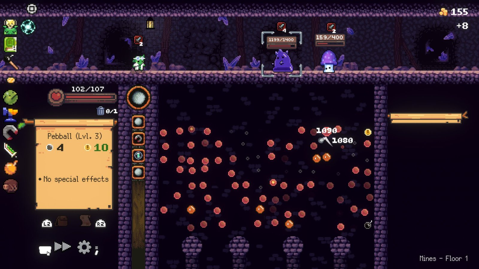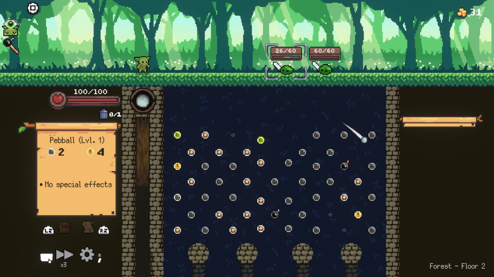 A jogabilidade de Peglin é uma combinação de Peggle e Slay the Spire. Os inimigos são fortes, e se você for derrotado seu progresso é perdido, mas você tem orbes com efeitos especiais e relíquias incríveis que influenciam tanto seus inimigos, quanto a física que usará para derrotá-los.