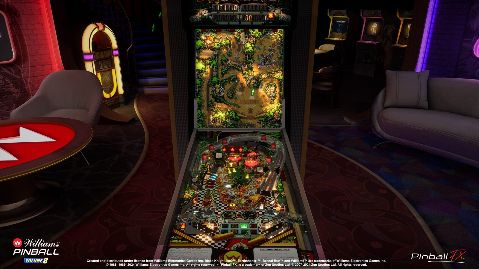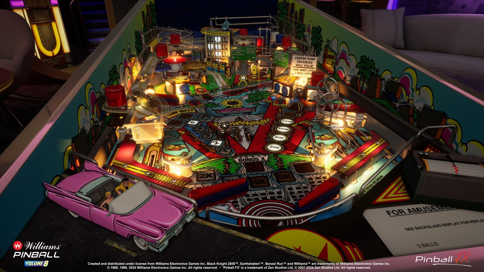 Até o momento, o Pinball FX apresenta mais de 120 mesas, incluindo aquelas baseadas em propriedades icônicas de grandes estúdios como Disney, Legendary, Lucasfilm, Marvel Entertainment, NBC Universal e Paramount Pictures. e agora traz o pacote de DLC Williams™ Pinball Volume 8 e oferece as mesas Earthshaker! , um clássico sísmico de 1989 conhecido por seus recursos inovadores e jogabilidade temática de terremoto.