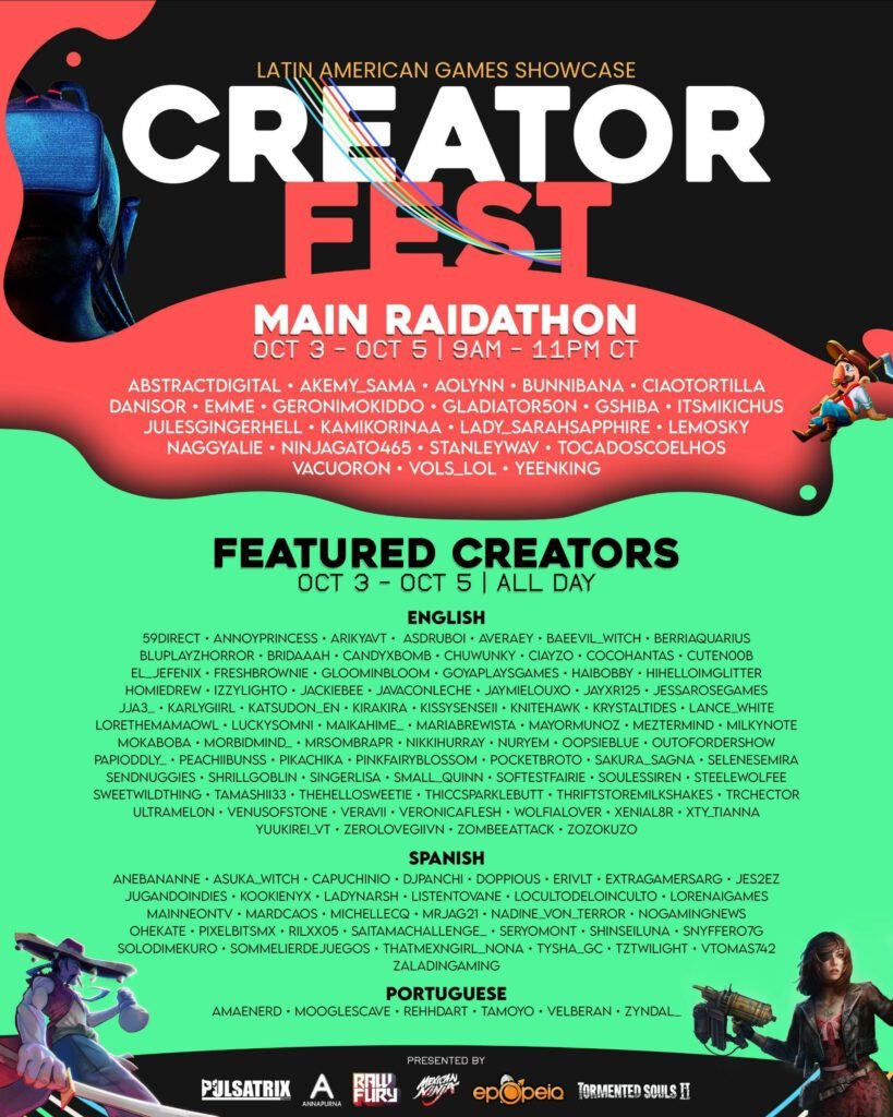 De 3 a 5 de outubro de 2025, o Latin American Games Showcase (LAGS) realizará a primeira edição da Creator Fest, um evento de transmissões dedicado a celebrar e apoiar jogos desenvolvidos na América Latina!