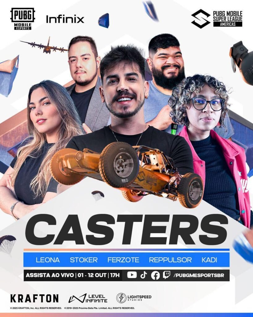 A PMSL Americas Fall 2025 será transmitida nos canais oficiais do PUBG MOBILE no YouTubeFacebook, Instagram e TikTok a partir das 17h nos dias de competição, com narração e comentários de Leona, Stoker, Ferzote, Reppulsor e Kadi, que vão agitar a transmissão.
