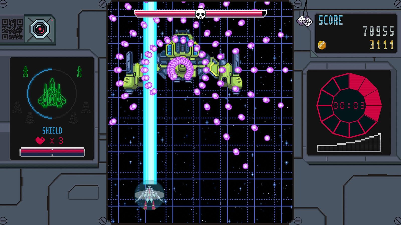 Shoot’em up vertical foi um estilo muito popular nos anos 90 e todos os principais pontos de um genuíno jogo neste estilo estão representados neste título. São 5 de chuva de balas e com inúmeros upgrades momentâneos para que você enfrente esquadrões de inimigos, subchefes e chefes altamente desafiadores, que vão lhe exigir sempre foco e habilidade.