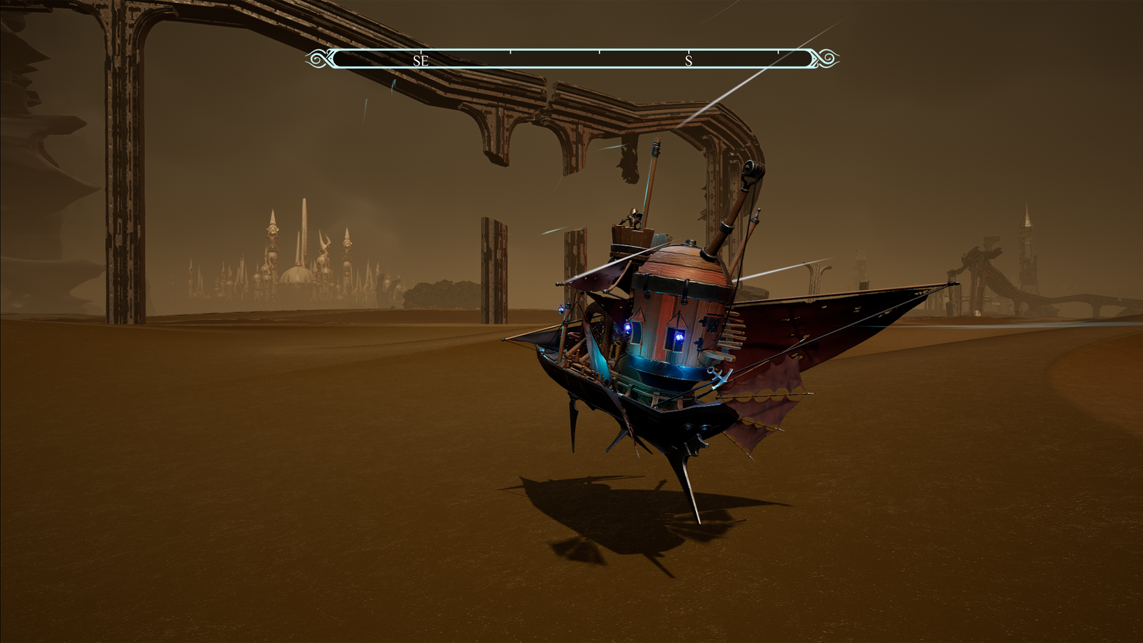 Você assume o papel de um cavaleiro remanescente, explorando um mundo fragmentado por ilhas perdidas em meio a dunas infinitas. A locomoção acontece em uma embarcação que navega pela areia, trazendo uma sensação constante de isolamento e contemplação.