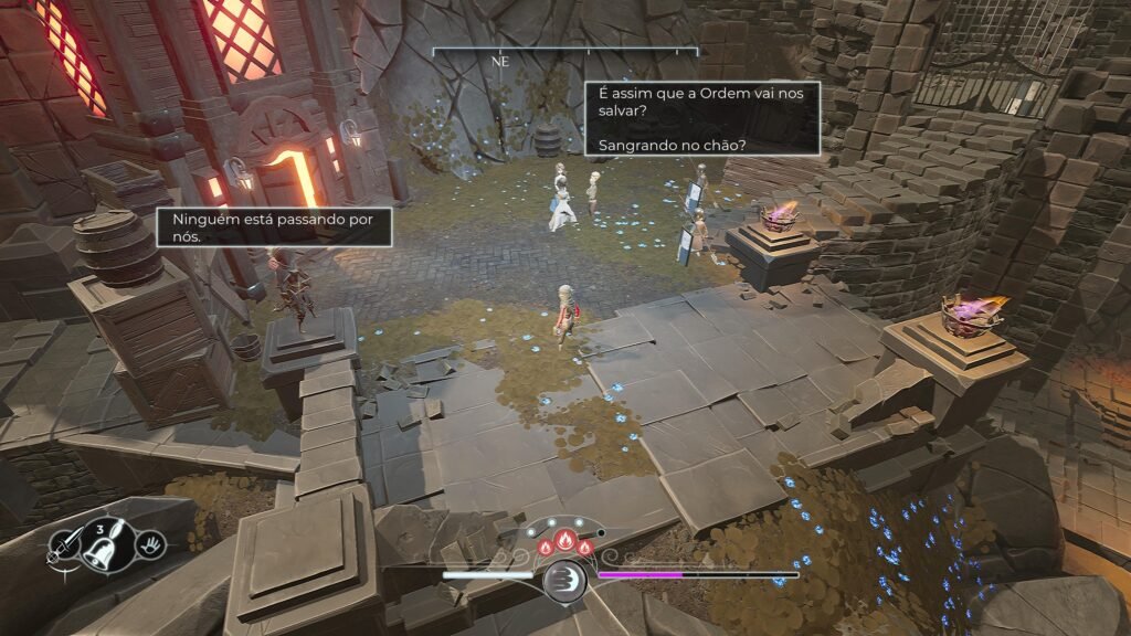 A base do gameplay segue o DNA dos Soulslike, mas com uma visão isométrica que muda completamente a dinâmica.