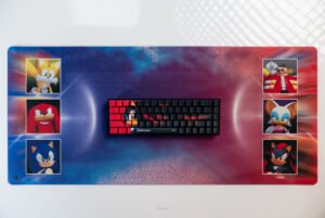 A coleção é complementada por um conjunto de teclas Basecamp 75+ com o design do Sonic CD (vendido separadamente) e quatro mousepads XL Control que harmonizam todo o conjunto.