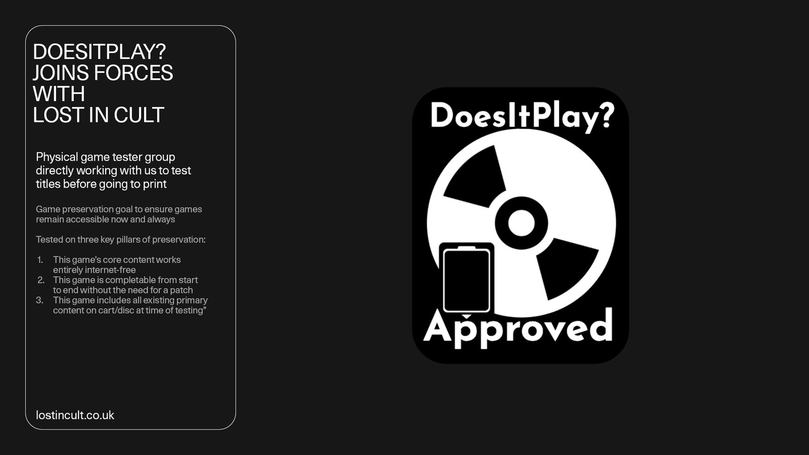 A DoesItPlay? vem trabalhando incansavelmente para garantir que essas experiências fantásticas permaneçam acessíveis agora e sempre. Alinhar-se à missão da Lost In Cult de fornecer os melhores jogos físicos publicados até o momento é agora o próximo passo se seus esforços para garantir lançamentos físicos de qualidade que resistam ao teste do tempo e deixem desenvolvedores e jogadores igualmente orgulhosos.