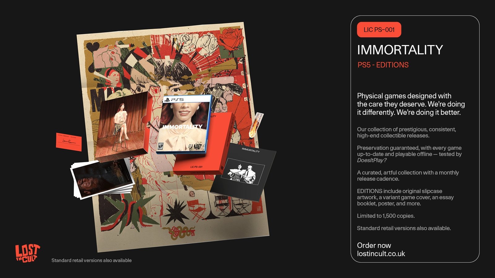 “À medida que o mundo ao redor parece cada vez mais impermanente, a mídia física parece ainda mais essencial”, acrescenta Natalie Watson, produtora de IMMORTALITY . “Com isso em mente, garantir que IMMORTALITY pudesse ter certeza de sua própria imortalidade era de extrema importância para a equipe, e somos muito gratos por termos trabalhado com a Lost in Cult para que isso acontecesse.”