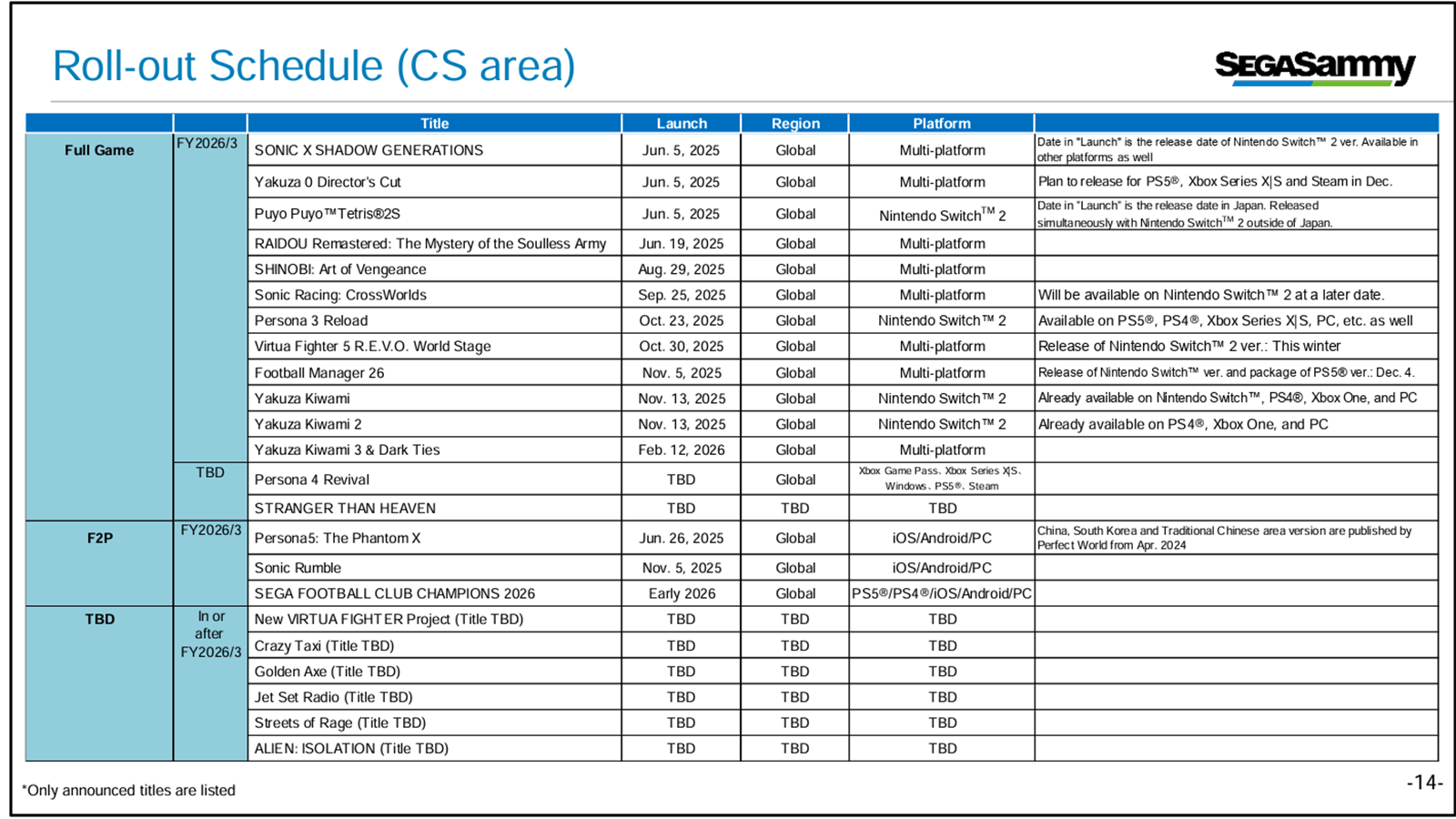 Virtua Fighter e Golden Axe, na esperança de encontrar mais sucessos. Até mesmo a sequência de Alien: Isolation, tão desejada pelos fãs (atualmente em desenvolvimento na Creative Assembly), continua prevista para os próximos anos.