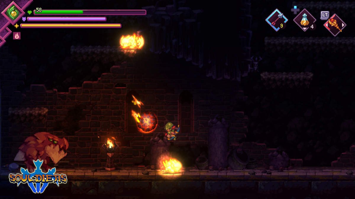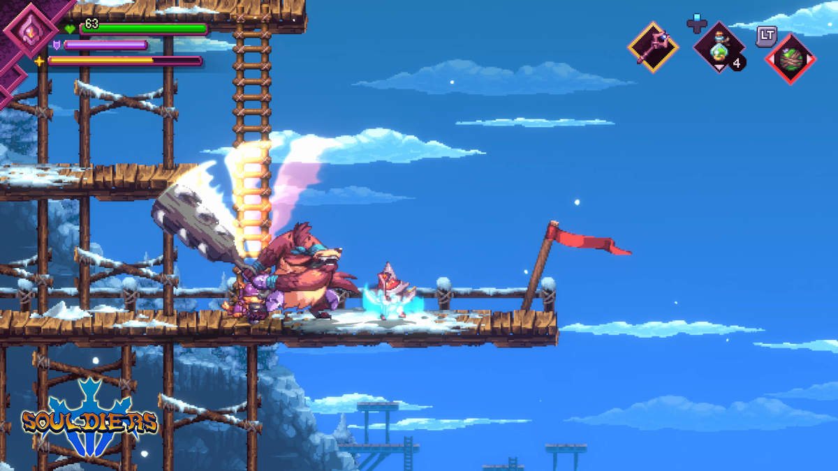 A jogabilidade é bem dinâmica e Souldiers não traz aquele peso característicos dos Soulsvanias como Blasphemous, Salt and Sanctuary, Hollow Knight e Dead Cells, com inimigos e chefes implacáveis. O mapa é bem cara de metroidvanias com pontos de referência, caminhos ocultos, segredos, baús…