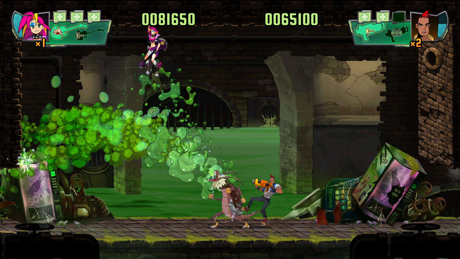 Os jogadores podem escolher entre dois personagens principais: Victoria, uma aspirante a estrela do rock, e Adrian, um policial de academia, cada um com habilidades e armas únicas. Além disso, o jogo suporta modo cooperativo local, permitindo que dois jogadores enfrentem a aventura juntos, o que aumenta a diversão e a estratégia.
