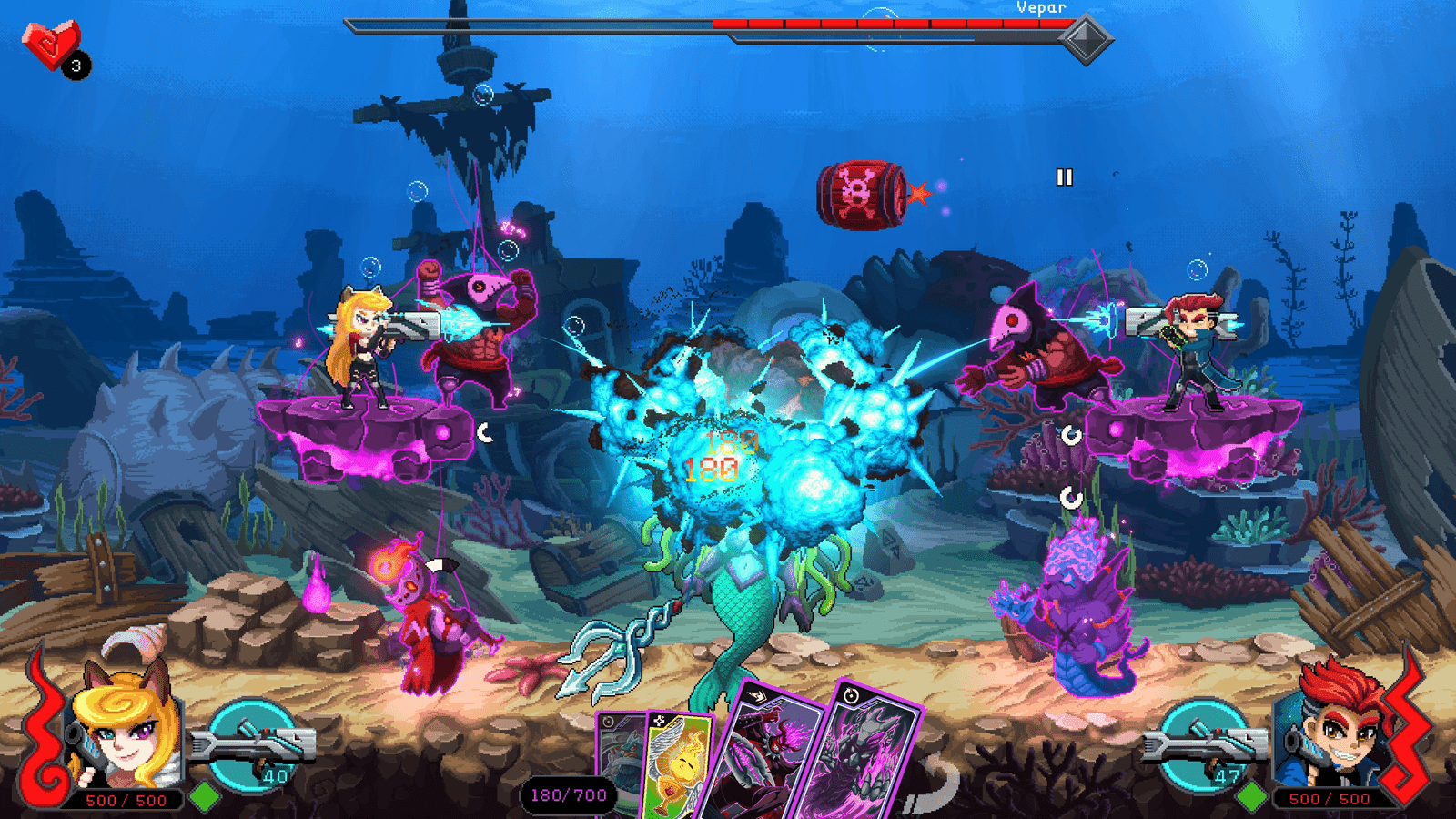 Quebre os escudos dos inimigos usando combinações de ataques para capturar seus espíritos em cartas, adicionando-os ao seu baralho. Transforme todo inimigo que encontrar em um de seus espíritos demoníacos.
