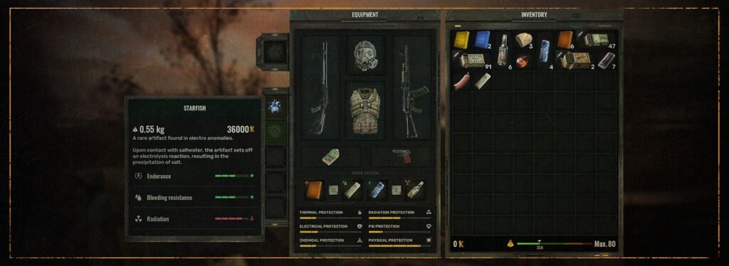 Interface redesenhada mostrando proteção contra os perigos da Zona. Consumíveis e artefatos agora possuem cinco níveis de qualidade em vez de três. Nova barra de equilíbrio de radiação para artefatos equipados.
