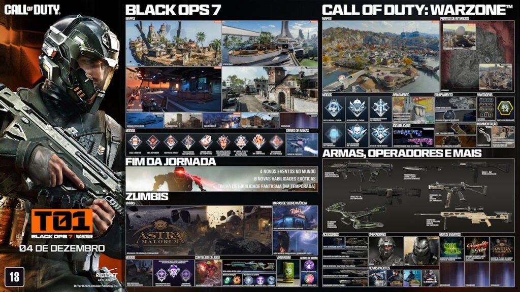 A Temporada 1 de Call of Duty: Black Ops 7 e Warzone chega no dia 4 de dezembro para todas as plataformas. Os jogadores terão novidades no conteúdo Fim da Jornada, mapas novos no modo Zumbis e Warzone, além de novos operadores, armas, equipamentos e mais.