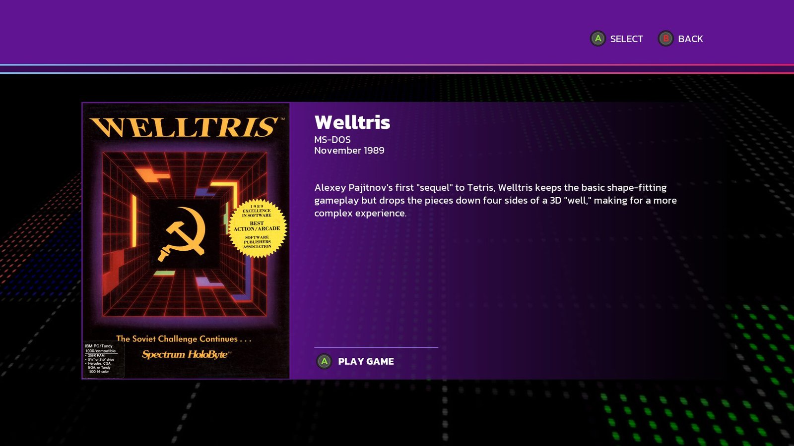 A primeira continuação do Tetris criada por Alexey Pajitnov, Welltris é uma variante adorada na qual Tetriminos (e outras formas) caem em quatro lados de um poço.