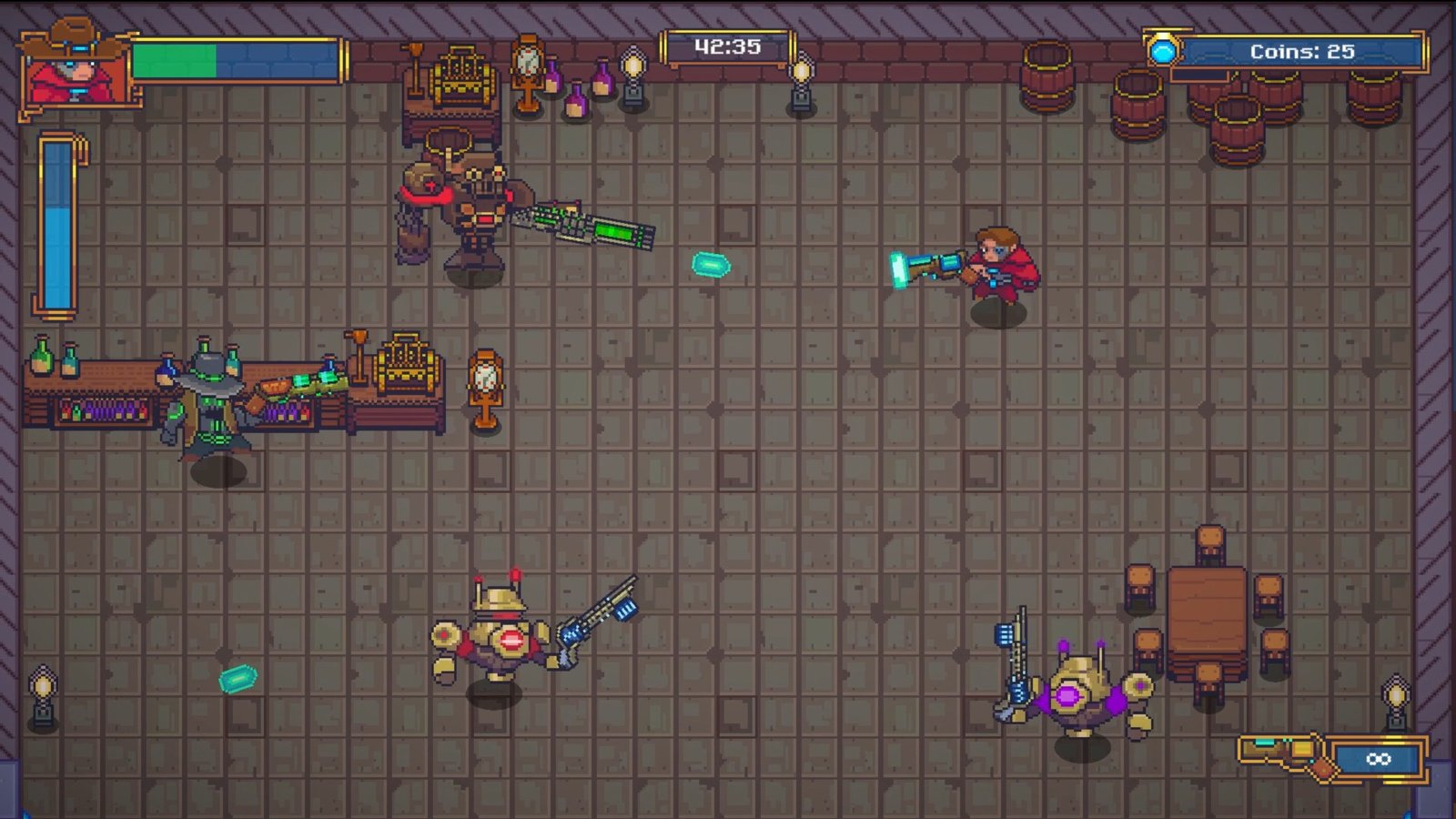 Exploda ondas de vilões ciborgues e monstros mecânicos em monóculos e cartolas enquanto explora dezenas de salas geradas processualmente que mudam a cada corrida para mantê-lo alerta com suas botas de couro. Destrua objetos ou use-os como cobertura. Colete fichas de energia valiosas para comprar novas armas em lojas. Use rajadas de energia para correr e desviar.