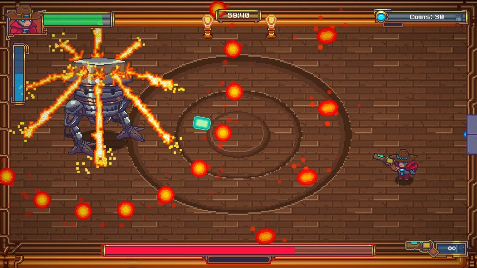 O oeste selvagem fica ainda mais selvagem com o desenvolvimento da tecnologia cibernética, e cabe a você derrubar as gangues de bandidos que usam essa tecnologia contra os moradores honestos e trabalhadores! Entre no papel de um pistoleiro steampunk com um braço mecânico e muitas armas aprimoradas à sua disposição.The Legend of Cyber Cowboy é um jogo de tiro de cima para baixo com bastante ação e tiroteio no estilo bullet hell