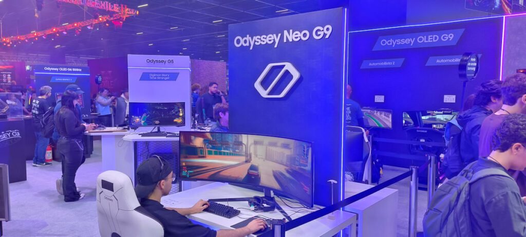Falando sobre o ecosistema gamer da Samsng, há para os gamers de PC, a linha de monitores Odyssey, disponível em estações de jogos de alta performance. Vimos o novíssimo monitor Odyssey OLED G6 500Hz de 27″ – o primeiro monitor OLED do mundo com taxa de atualização de até 500Hz, performando no estande e foi impressionante. Outro destaque interessante na lnha de monitores Odyssey Neo G9 de 57 polegadas, modelo com altíssima definição DUHD (Dual Ultra-High-Definition), além de uma curvatura de tela de 1000R4 na proporção 32:9. Experimente jogar nele!